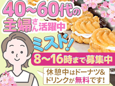 春の新スタッフ大募集★ 平日のみもOK!週2日・4時間~の柔軟シフト◎ 主婦さん活躍中* 休憩中はドーナツ&ドリンク無料♪