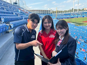 ☆"推せる"ポイント☆ <Point1:とにかく仲が良い!> 歓迎会をしたり、卒業シーズンにプレゼントを送ることも♪ ヘルプで他の配置に入ることもあり、いろんなタイプの人に出会える! 社員もバイトもフレンドリーな人が多いから、なんでも相談しやすい◎ <Point2:シフト柔軟!> 「急に暇になったからシフトを入れたい!」 なんて相談もできちゃう◎ <Point3:臨場感を味わえる!> 得点時やファインプレーで聞こえてくる歓声にワクワク! 神宮球場のスタッフとして、一緒に試合をサポートしよう☆彡